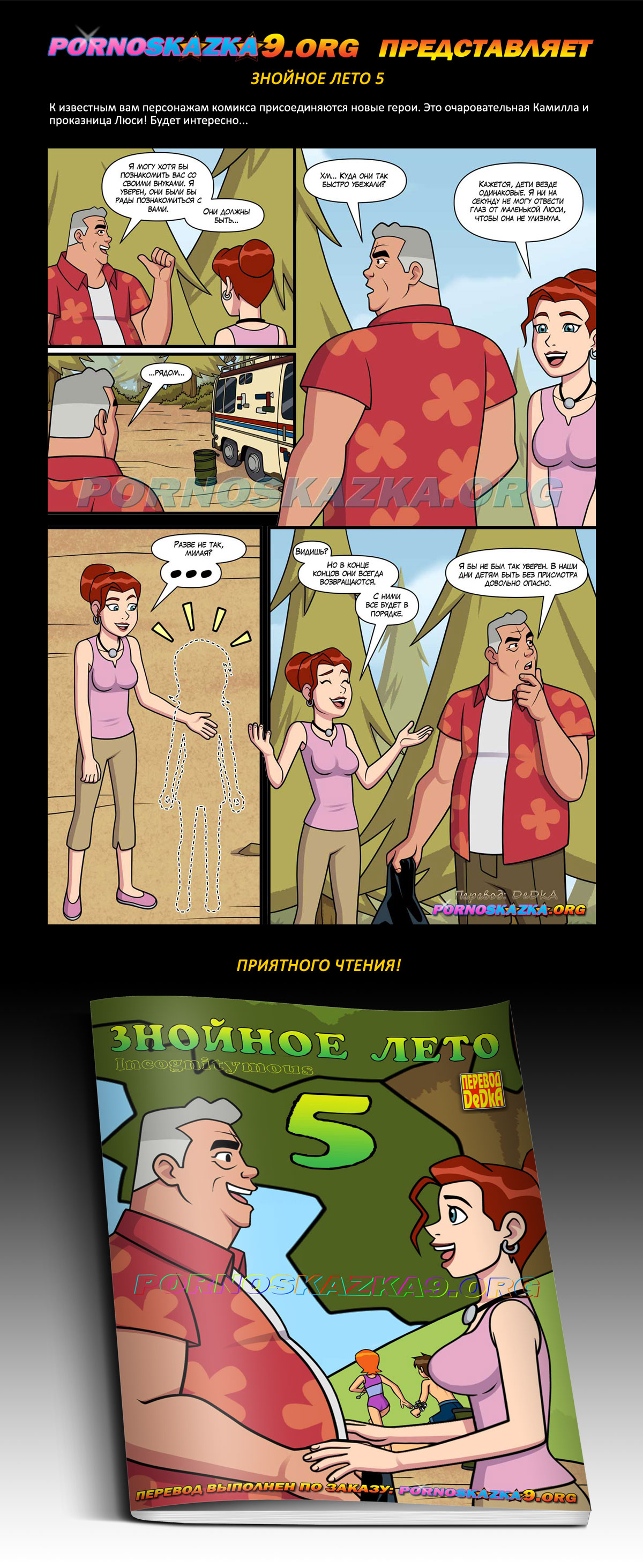 Порно комикс Знойное лето. Часть 7. Макс знакомит Бена и Гвен со своим старым другом и коллегой Уэсом Грином, где они также встречают его внучку Каю. И Бену в головы сразу приходит мысль, та самая мысль, которая приходит к нему всегда, когда у него между нок кое-что начинает шевелиться…